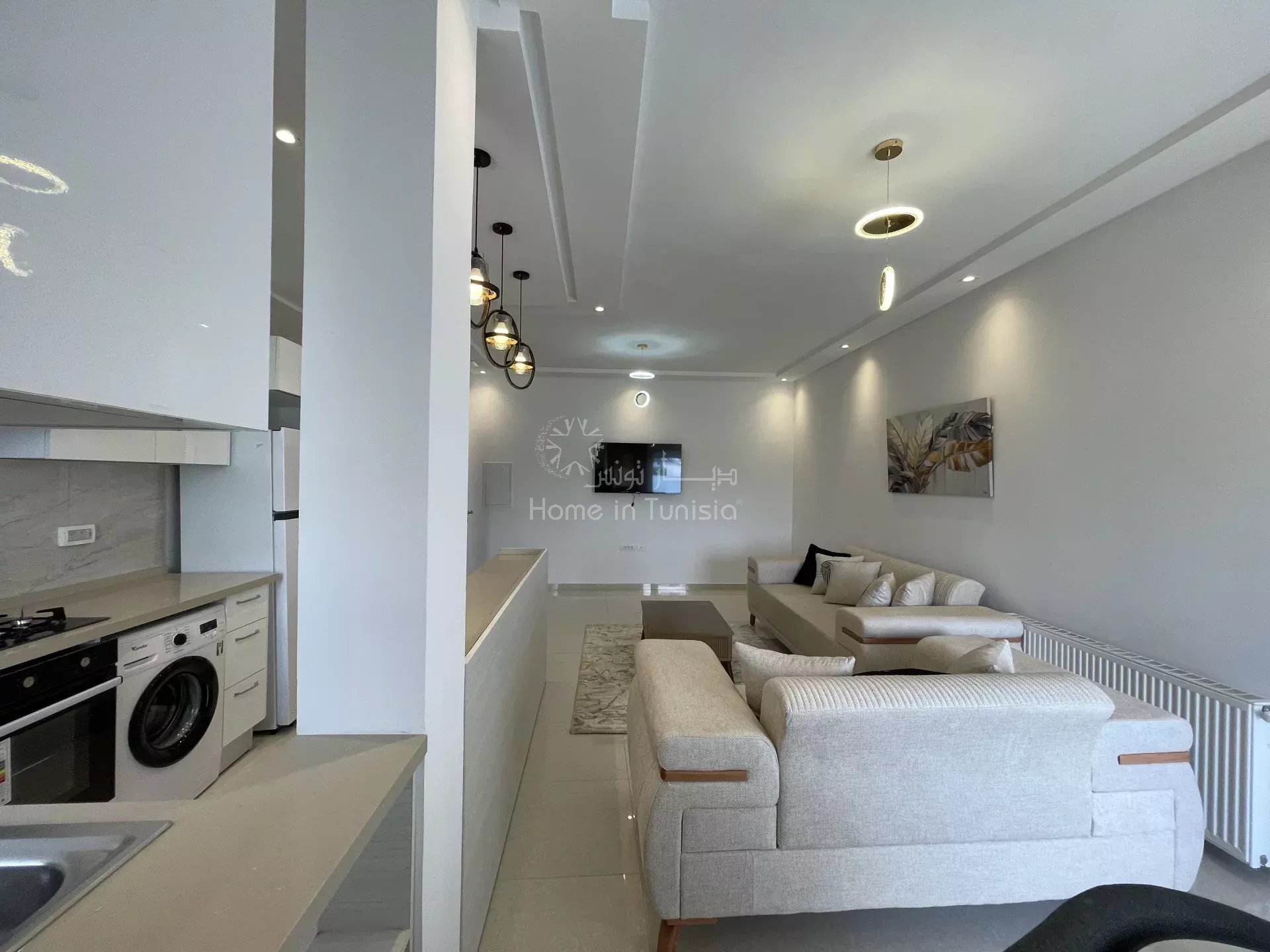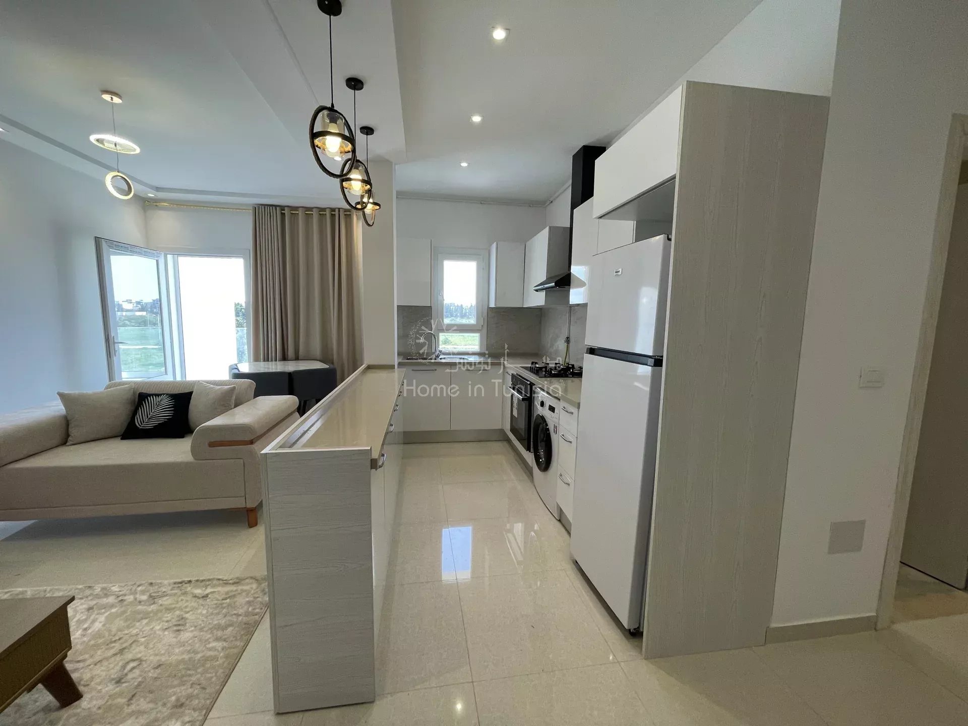 Salon lumineux avec cuisine ouverte aménagée