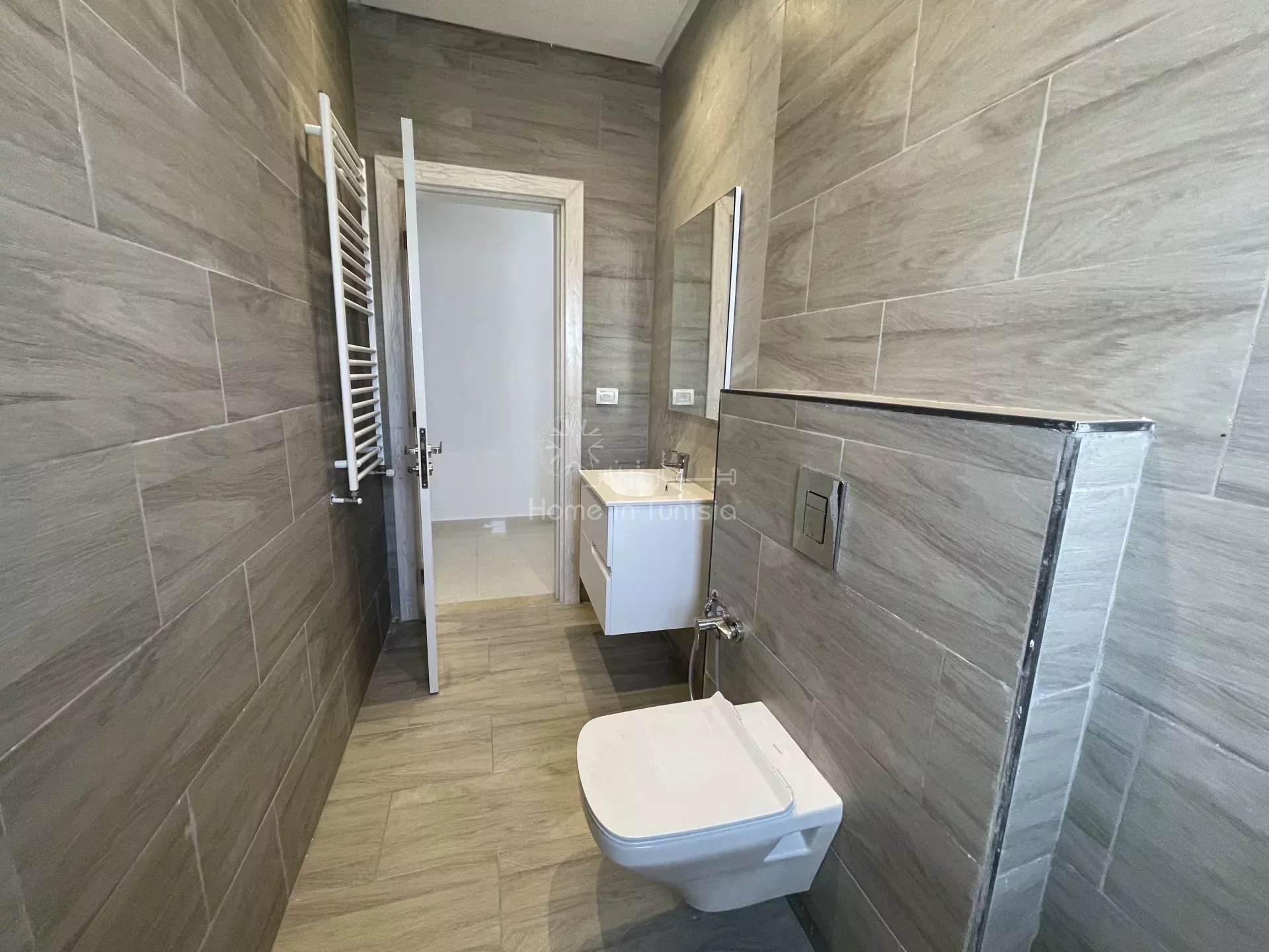 a louer un appartement de type S2 situé au 2ᵉ étage d’un petit immeuble sans ascenseur, dans une petite résidence privée et calme à Chott Meriem.